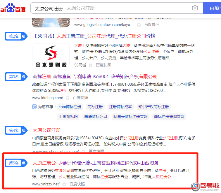 以上就是西安網(wǎng)站優(yōu)化巨海科技提供的近期案例,更多關于“關鍵詞 ”太原公司注冊等”的相關效果,巨海SEO可以讓潛在有需求的客戶及時找到你,投入成本低回報率高,想了解太原公司注冊等相關的更多相關內容盡在巨海科技!請聯(lián)系我們的在線客服,希望對你有所幫助。